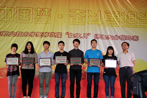 学院执行院长吕振合教授,正院级巡视员洪永铿教授,副院长杜宝山教授,党委副书记、副院长王其军教授,党委委员、工会主席洪骏副教授,党委副书记张乐弟等学院领导及中层领导出席了本次活动。学院2000多名学生以及各兄弟院校学生代表共同观看了此次比赛。我院八个系参加了本次比赛,第一支出场的商务系代表队以一首慷慨激昂的歌曲——《我的祖国》拉开了整场比赛的序幕。计信系的一首《精忠报国》激起了现场师生们的雄心壮志,他们激情的演唱把比赛推向了高潮。第八支参赛队会计系以振奋人心的诗朗诵先声夺人,紧接着又以一曲激情澎湃的《没有共产党就没有新中国》震撼全场,感人的歌声把我们带回到斗志斗勇,保卫国家的峥嵘岁月。最终,会计系凭借着激情的演唱勇夺本场比赛的桂冠,计信系与管理系分获二、三等奖;财管系和建工系分别荣获组织工作奖和精神风貌奖,语言系、商务系和贸易系荣获优秀奖。