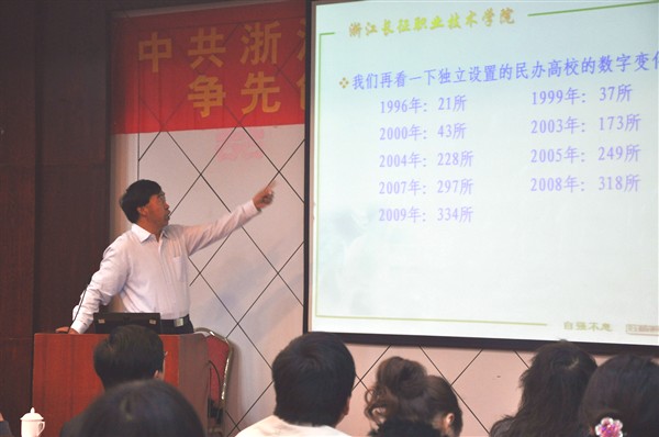 为将“创先争优”活动推向深入,根据学院2010年度党建工作计划,学院党委于2010年11月12-13日在衢州召开“创先争优”专题党员大会。会议由党委副书记洪骏主持,学院执行院长吕振合、执行董事陈余春、正院级巡视员、教学指导委员会主任洪永铿、副院长杜宝山、傅建辉、党委副书记张乐弟、副院长王其军、党委委员胡泽方出席了会议,全院一百二十余名教职工党员参加了大会。会上执行院长吕振合教授作了题为《民办高等教育的发展形势与我们的使命》的专题报告。