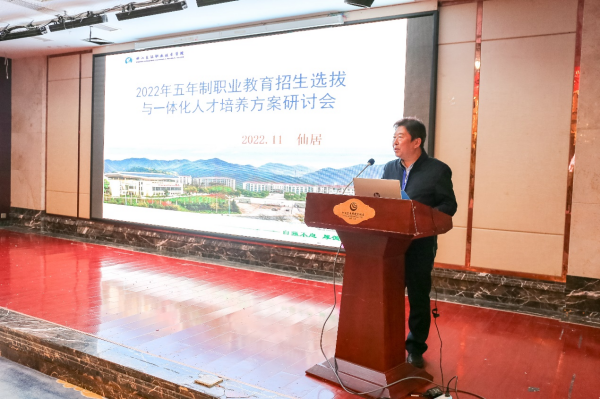 为落实浙江省教育厅关于做好中高职一体化五年制职业教育工作等有关文件精神,加快推进学校现代化职业教育体系建设,我校于11月4日在仙居皇嘉国际大酒店国际厅召开2022年五年制职业教育招生选拔与一体化人才培养方案研讨会。副院长杜宝山,教务处、学生处、招生就业指导处主要负责人,二级学院院长和相关专业教研室主任,以及来自全省的42所合作中职学校校领导、相关职能部门负责人、合作专业教师等共112人参加了会议。会议由杜宝山主持。