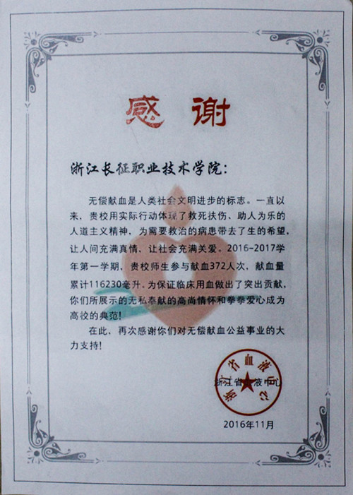 近日,浙江省血液中心给我院发来感谢信,感谢我院372名师生在2016-2017学年第一学期积极参与献血活动,总献血量累计达到116230毫升,为保证临床用血做出了突出贡献。对我院在活动中一贯的支持、信任和配合表示感谢。