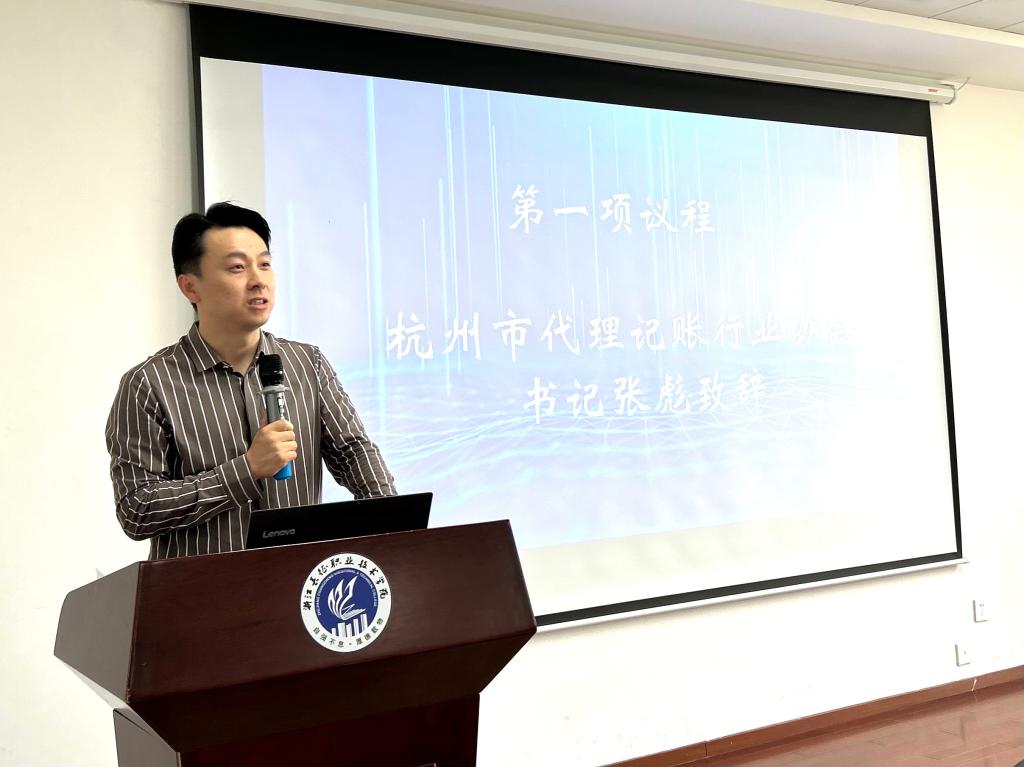 财务与会计学院院长代表财务与会计学院对莅临活动的杭州市代理记账行业协会的各位领导、专家表示热烈的欢迎,对加入“财税精英班”的2023级全体新生表示热烈祝贺。他指出,“财税精英班”以打造“高素质数智化”人才为目标,向社会、企业培养集财税管理服务一体复合型高素质应用人才。杭州市代理记账行业协会高度重视班级的教学工作,安排了理论水平扎实、管理经验丰富,实践能力强的专家来校为学生授课,将财税领域、会计领域前沿知识、技术、技能引入到课堂中,创设新型学习环境,为学生们创造企业大咖讲堂、企业特色活动、适岗实习训练等丰富多彩的教学实践活动。在未来学生实习就业方面,学院将依托杭州市代理记账行业协会行业资源优势,为精英班的学生们完善实习管理与指导,采用多种形式为合格毕业生提供就业岗位推荐。